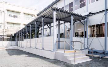 仮設校舎用にレンタル対応の間仕切やH鋼基礎・渡り廊下をご用意しています。